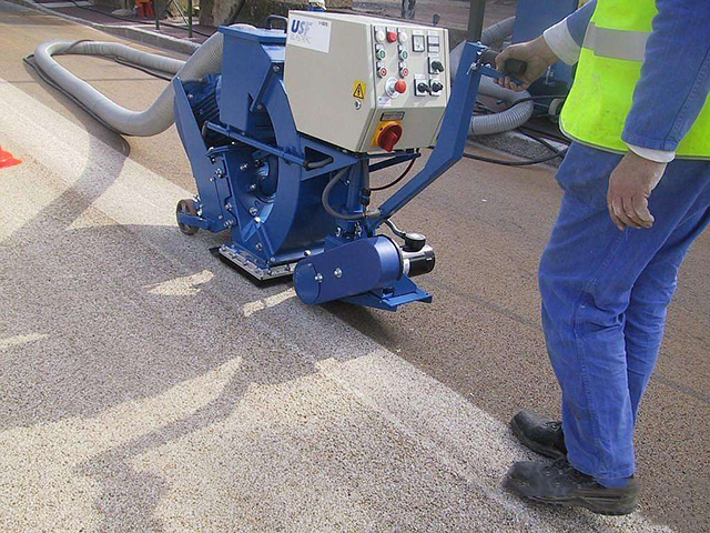 橋梁混凝土鋪裝層處理采用拋丸工藝,即利用拋丸機,拋除混凝土表面的浮漿。使用拋丸處理的表面粗糙均勻;不會破壞原混凝土結(jié)構(gòu)和平整度,并且可以完全去除浮漿和起砂,100%“創(chuàng)面”、露骨;但同時不會造成骨料的松動和微裂紋,為增強混凝土與瀝青面層提供更好的粘結(jié)。
